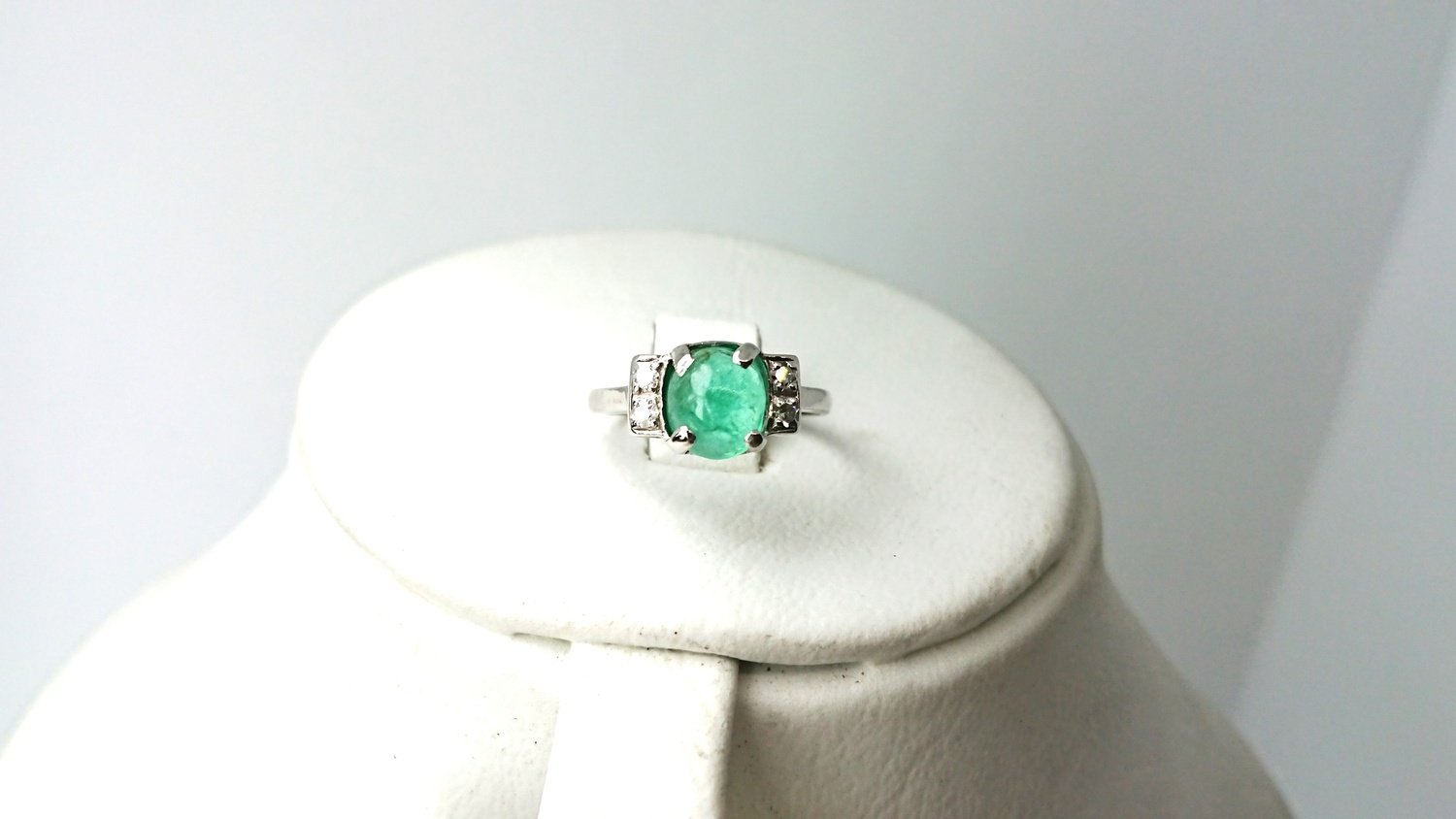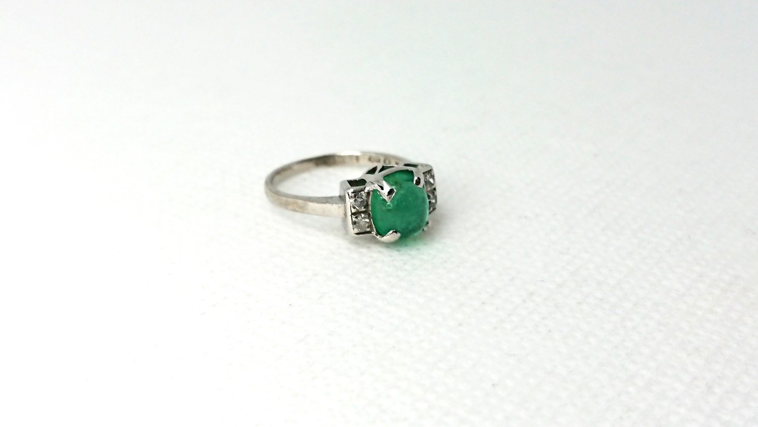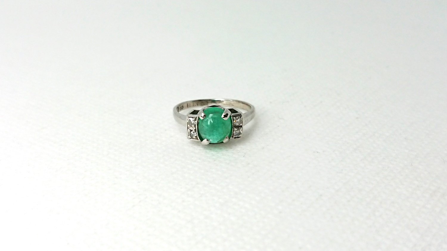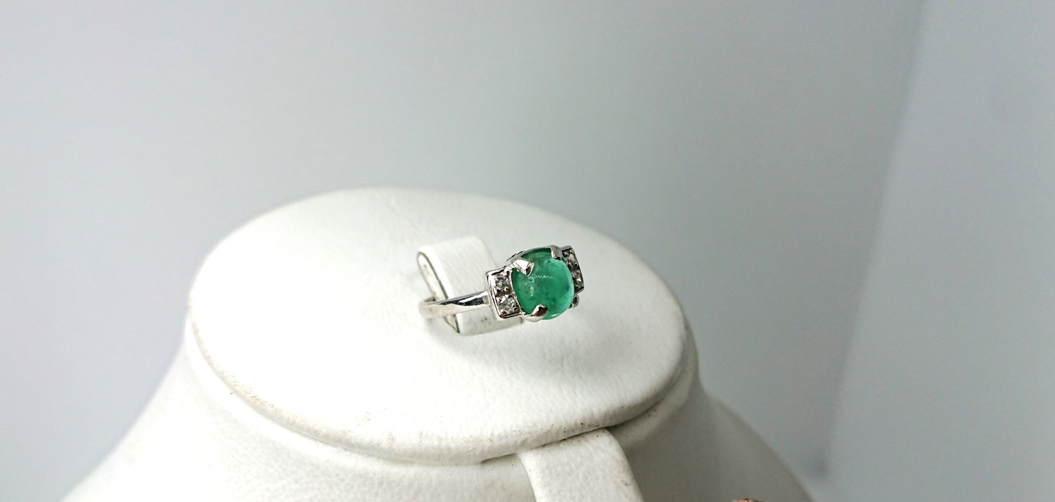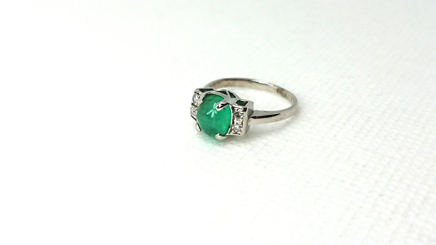 Otroligt vacker vintage ring i äkta 18K vitguld med äkta smaragd central sten 6,2mm och 4 äkta 8/8 diamanter totalt 0,12ct, handgjord fattning, mycket bra skick för en ring som är 101 år gammal, vacker klassisk design, svenskt guld från Juvelfabriken AB år 1925.