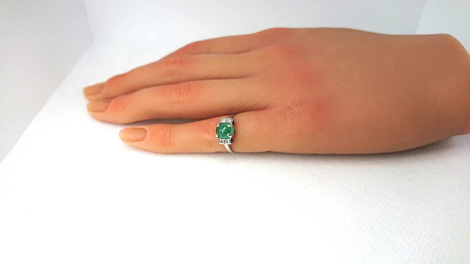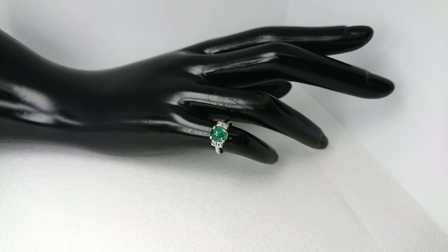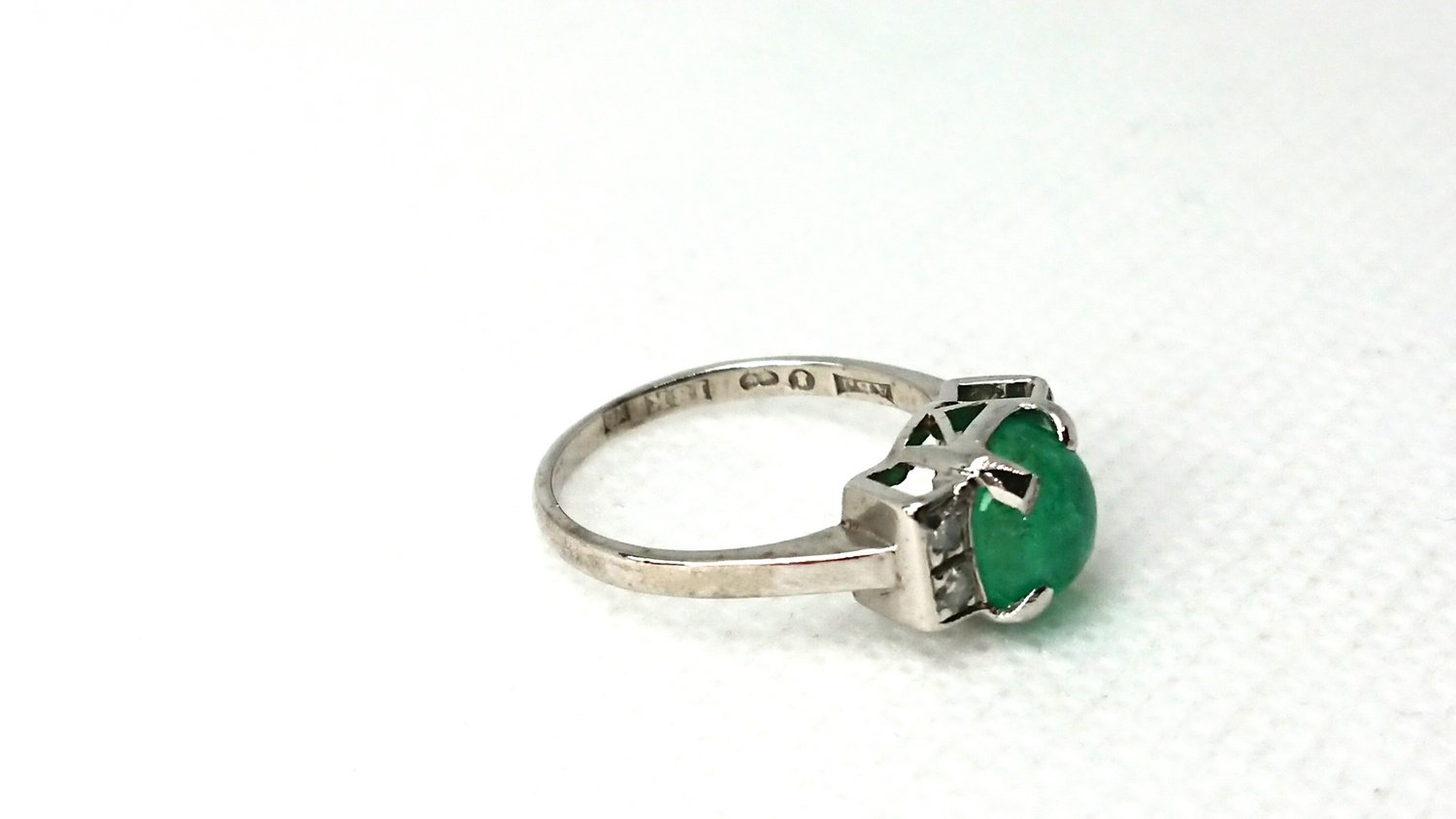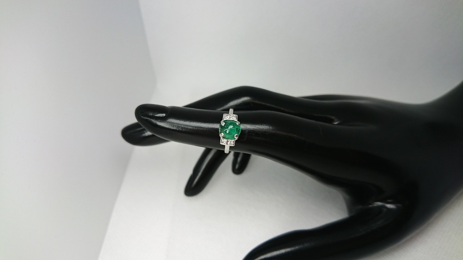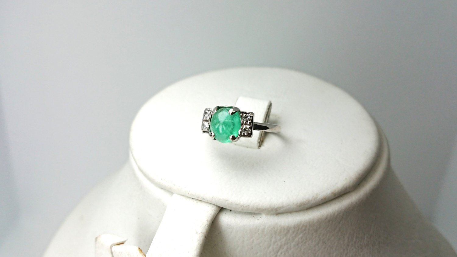 Otroligt vacker vintage ring i äkta 18K vitguld med äkta smaragd central sten 6,2mm och 4 äkta 8/8 diamanter totalt 0,12ct, handgjord fattning, mycket bra skick för en ring som är 101 år gammal, vacker klassisk design, svenskt guld från Juvelfabriken AB år 1925.